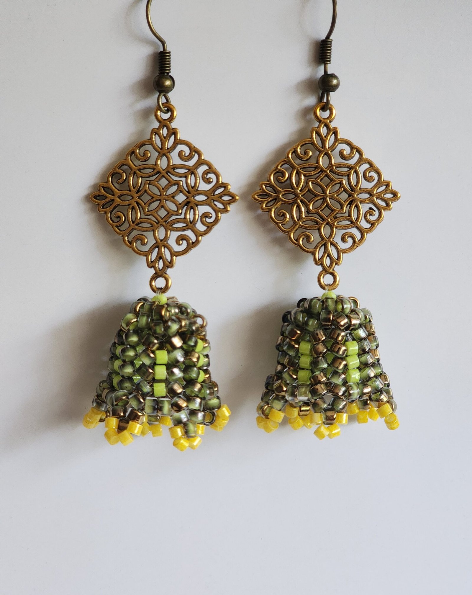 Copper, burnt green and golden beaded jhumka earrings, meticulously handcrafted using the best quality of delica beads and metal connector.